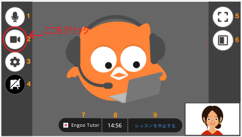 レッスンの際には、カメラを利用しないことを講師にお伝えください。カメラ付きの端末をお使いの場合、レッスンページ上のビデオのマークをクリックすると